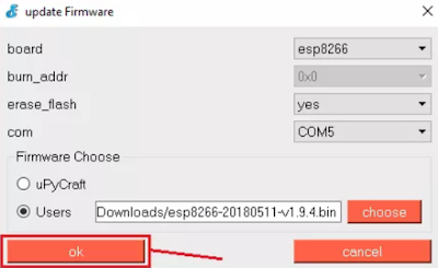 Firmware: Select “Users” and choose the ESP8266 .bin file downloaded earlier