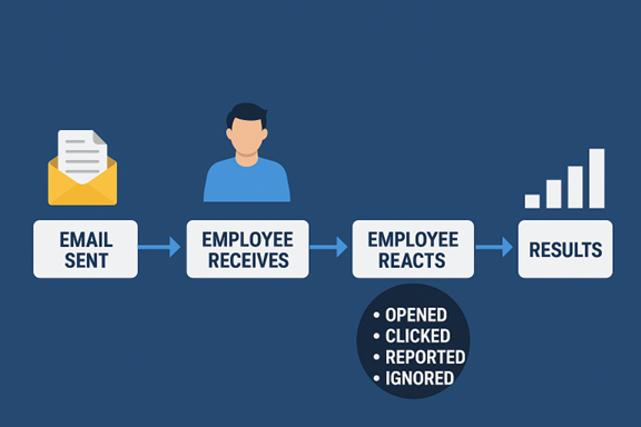 📈 Flow: Email Sent → Employee Receives → Employee Reacts (Opened, Clicked, Reported, Ignored) → Results.