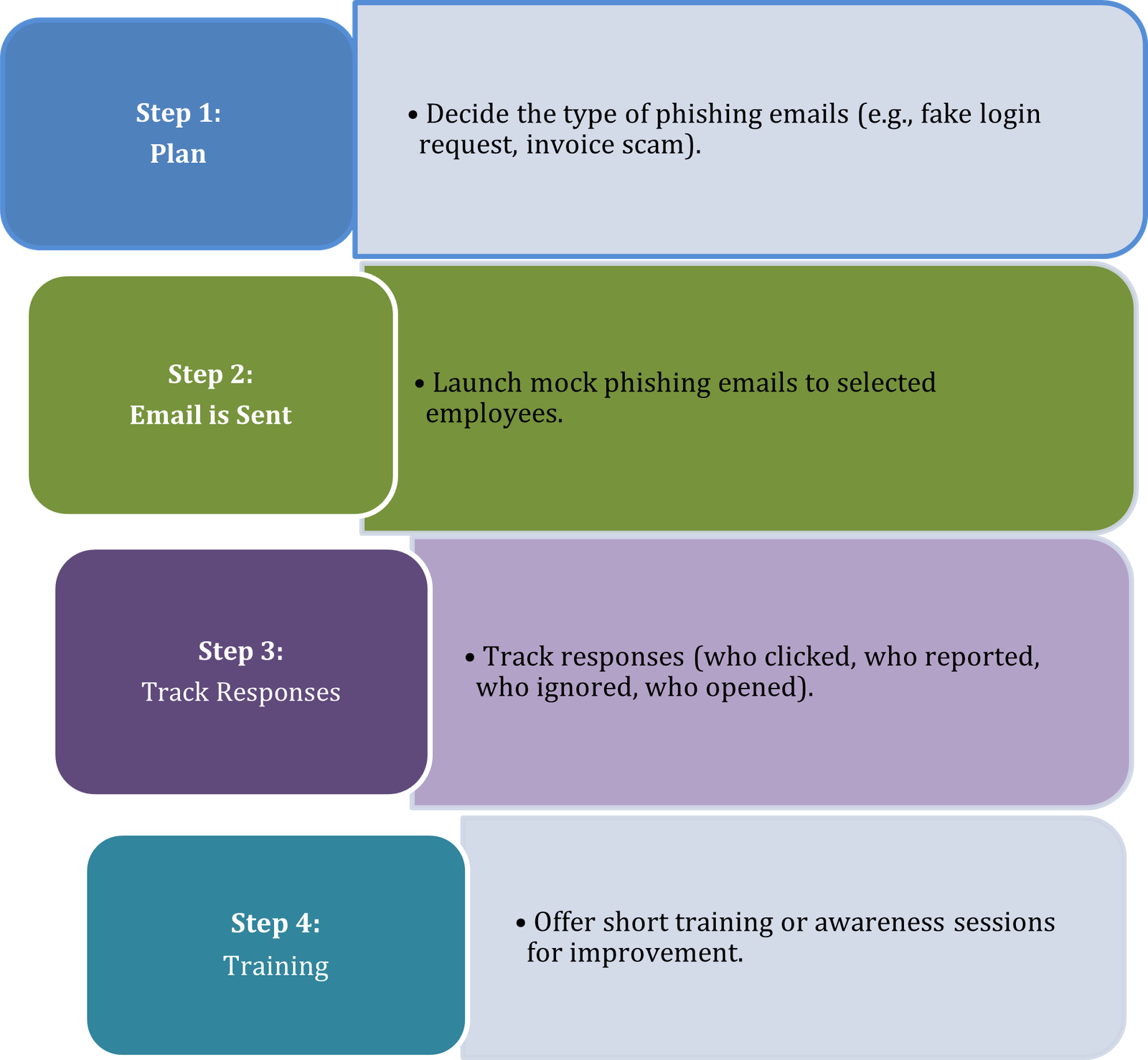 📩 Send Simulation Emails → 🧑‍💻 Employee Interaction → 📊 Track & Analyze Results → 🎓 Provide Awareness Training