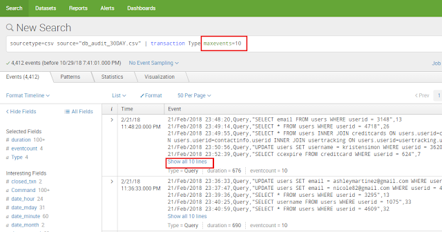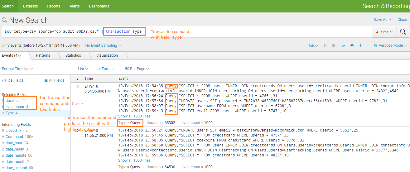 • Additionally, the transaction command in splunk adds two fields to the raw events, duration and eventcount.