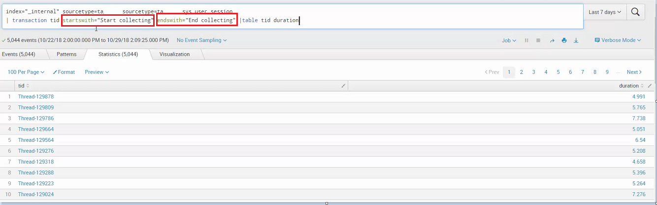 A search filtering the event starts with string ”Start collecting” and end with “End collecting” . Create the transaction which beginning with start collecting and ends with End collecting. “duration” and “eventcount” are fields which gets created while using transaction command.
